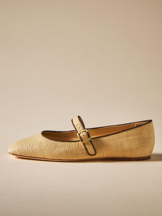 Sand Woven Square-Toe Boho Flats Mary Janes With Buckled Strap