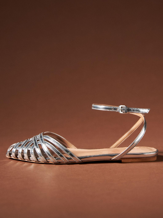 Metallic Silver Strappy Flats Pointy Closed Toe Sandals With Wrap Ankle Strap