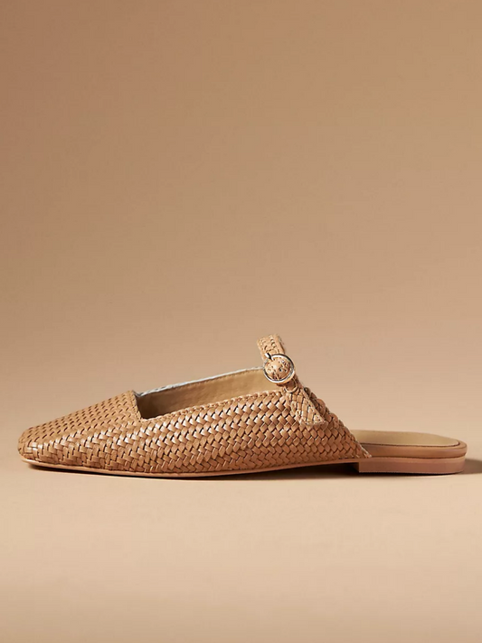Tan Woven Square-Toe Mary Janes Flat Slides Mules With Buckled Strap