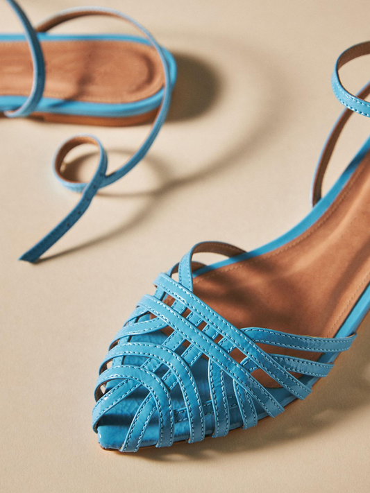 Blue Strappy Flats Pointy Closed Toe Sandals With Wrap Ankle Strap