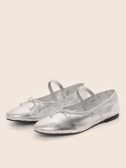Metallic Silver Bow Ballet Flats Mary Janes With Elastic Band