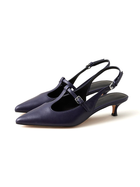 Dark Blue Pointed-Toe Mary Jane And Back Strap Kitten Heels