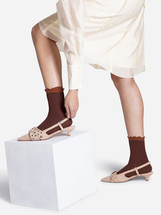 Beige Faux Suede Pointed-Toe Front Eyelets Back Strap Kitten Heels