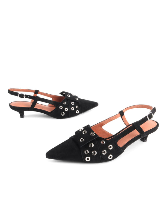 Black Faux Suede Pointed-Toe Front Eyelets Back Strap Kitten Heels