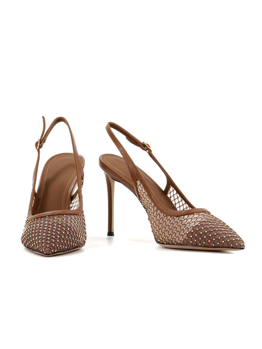Brown Mesh With Rhinestones Pointed-Toe Back Strap High Heels
