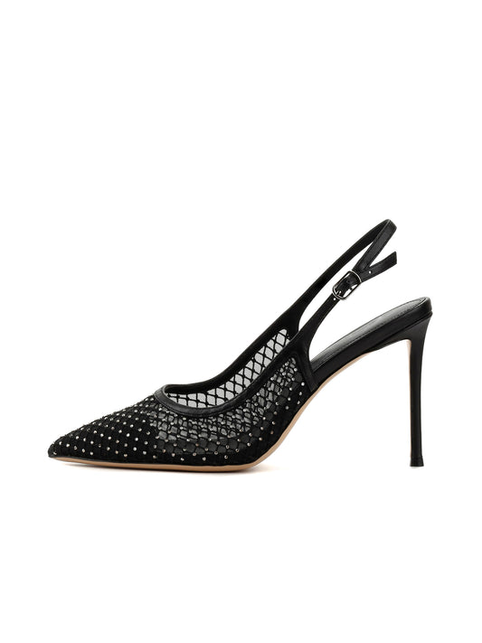 Black Mesh With Rhinestones Pointed-Toe Back Strap High Heels