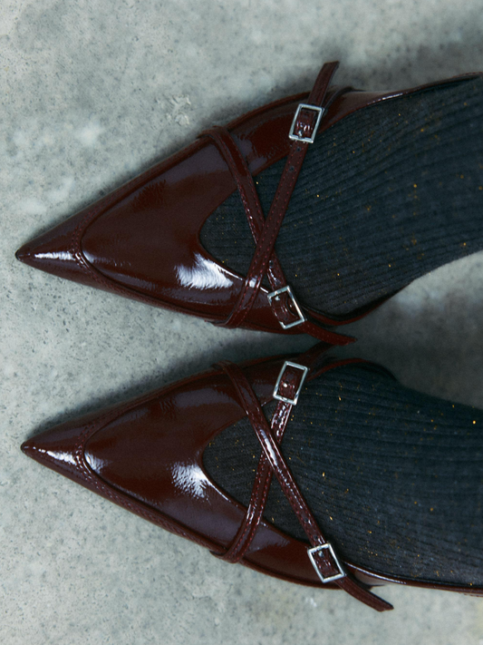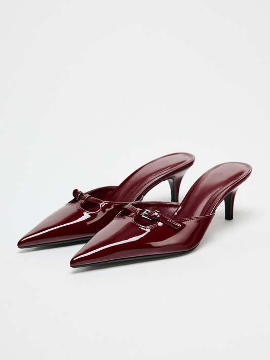 Burgundy Patent Pointed-Toe Double Buckle Front Strap Slingback Pump High Heels
