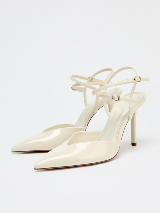 White Patent Pointed-Toe Double Buckle Ankle Strap Slingback Pump High Heels