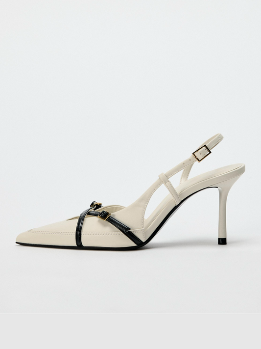 Bone Pointed-Toe Double Buckle Front Strap Slingback Pump High Heels