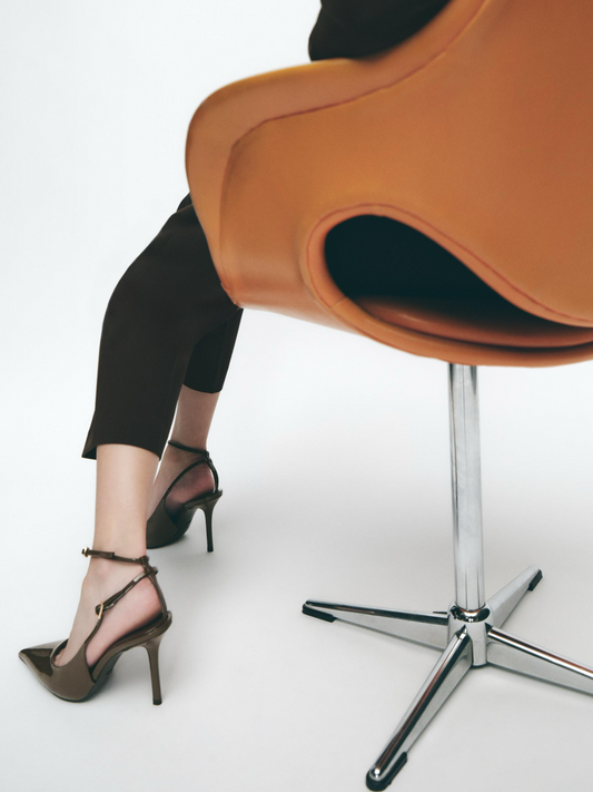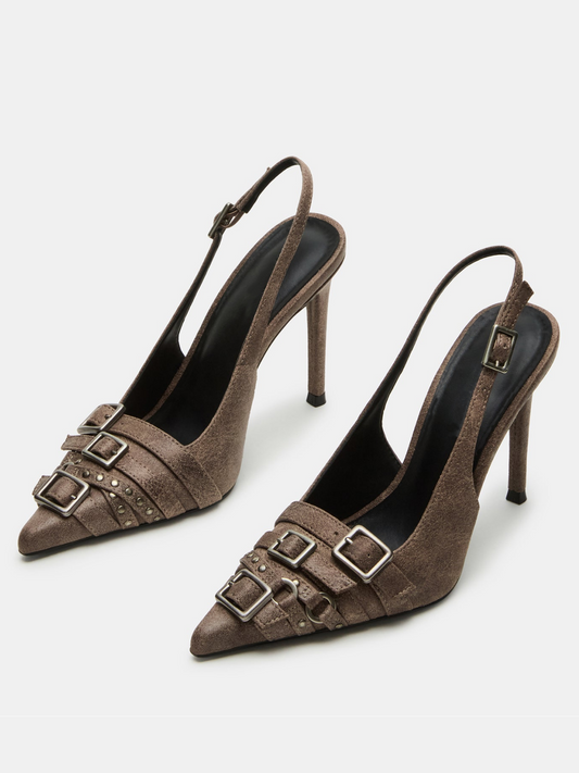 Taupe Pointed-Toe Studded Buckles Slingback Pump High Heels