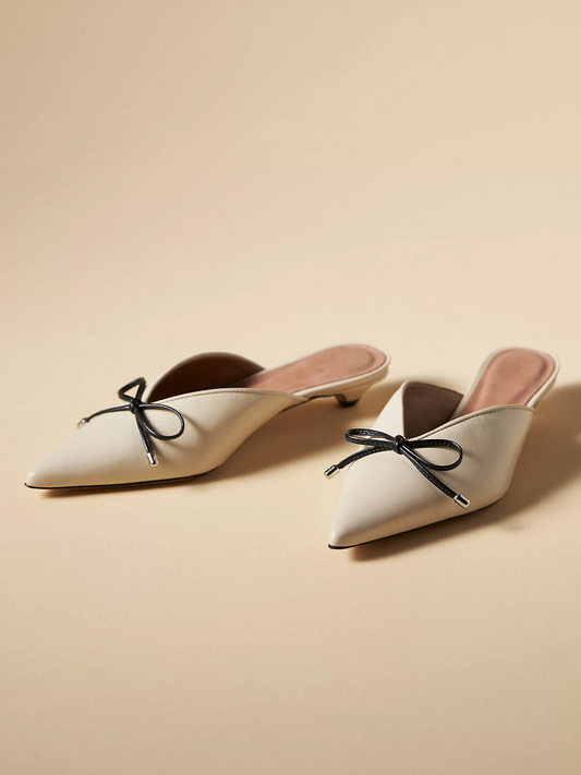 Cream Pointed-Toe Slip-On Kitten Heels With Bow