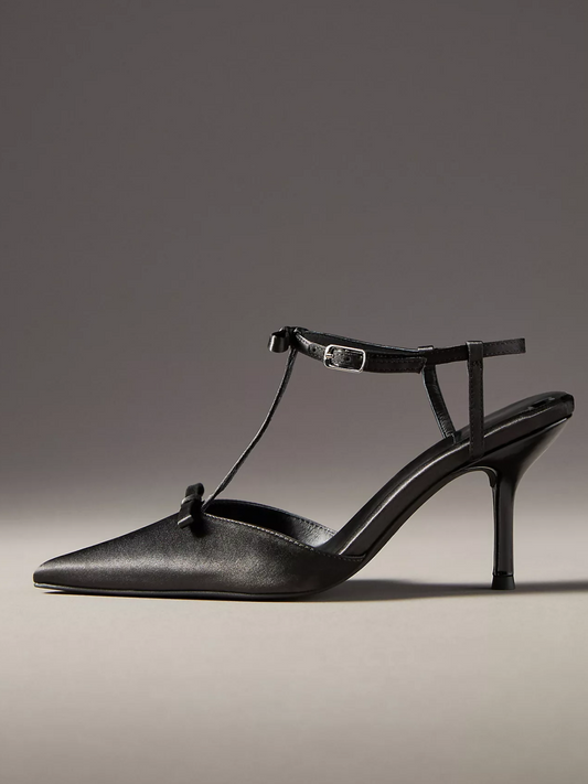 Black Satin Pointed-Toe Knot Ankle Strap Pump High Heels