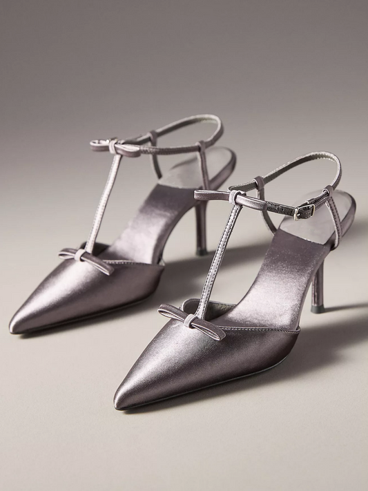 Silver Satin Pointed-Toe Knot Ankle Strap Pump High Heels