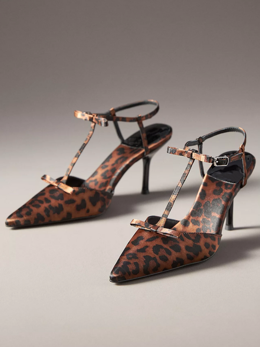 Leopard Satin Pointed-Toe Knot Ankle Strap Pump High Heels
