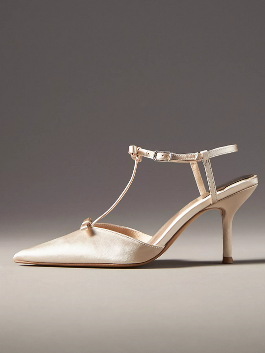 Ivory Satin Pointed-Toe Knot Ankle Strap Pump High Heels