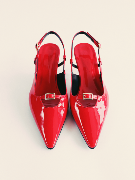 Red Patent Buckled Strap Hollow-Out Kitten Heels Slingback Pumps