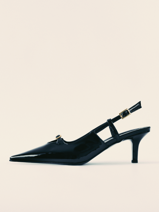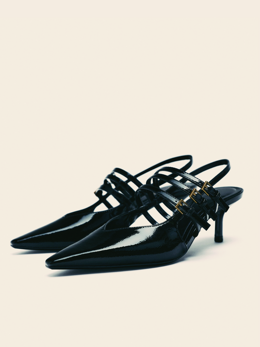 Black Patent Pointy Slingbacks Kitten Heels Pumps With Triple Buckled Straps