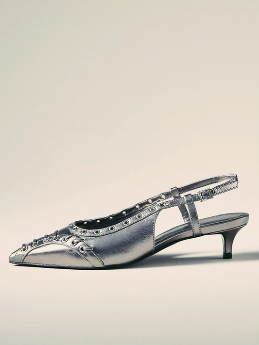 Metallic Silver Strappy Eyelet Pointy Kitten Heels Slingback Pumps