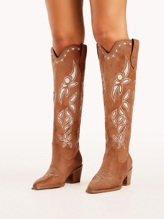 Dark Tan Faux Suede Snip-Toe Embroidery And Inlay Wide Calf Tall Knee High Cowgirl Boots