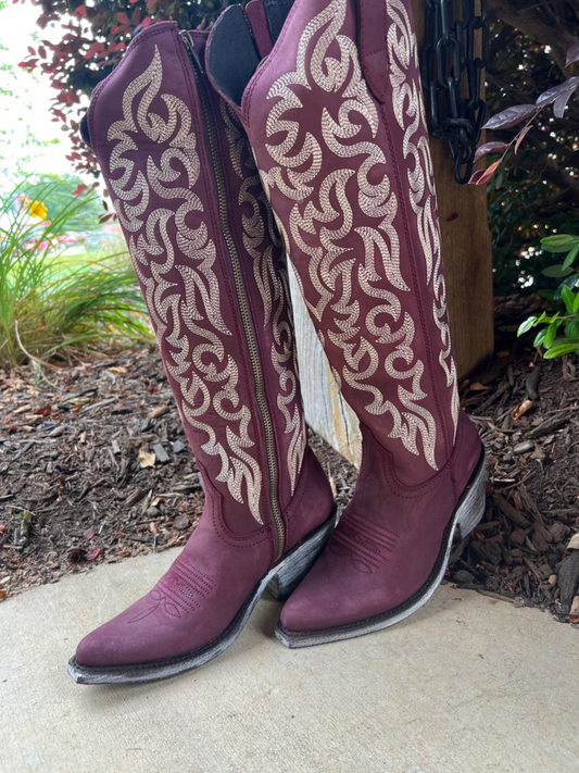 Round Pointed-Toe Embroidery Full-Zip Tall Knee High Cowgirl Boots - Burgundy