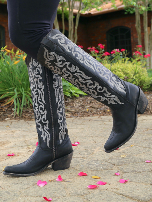 Round Pointed-Toe Embroidery Full-Zip Tall Knee High Cowgirl Boots - Black