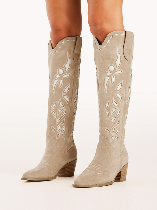 Taupe Faux Suede Snip-Toe Embroidery And Inlay Wide Calf Tall Knee High Cowgirl Boots