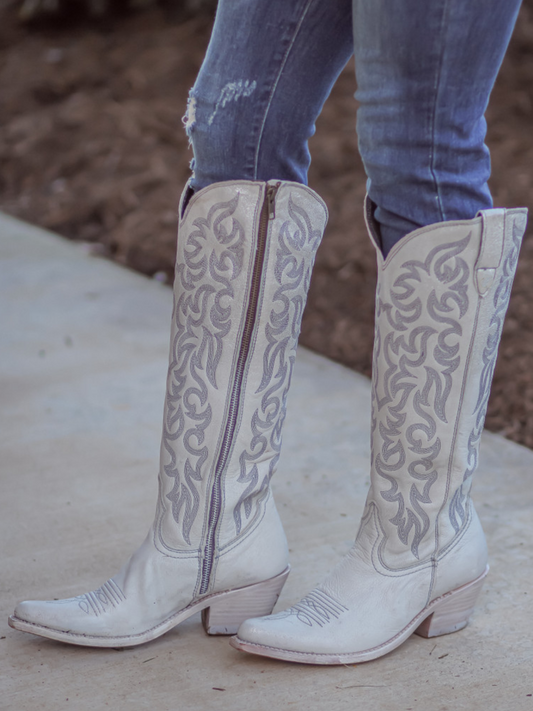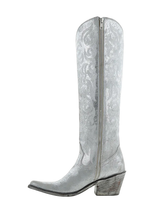 Distressed Metallic Round Pointed-Toe Embroidery Full-Zip Tall Knee High Cowgirl Boots - Silver