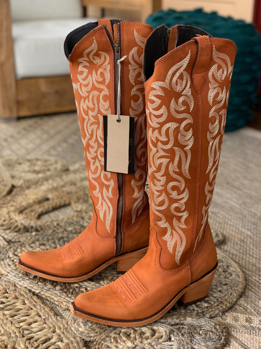 Round Pointed-Toe Embroidery Full-Zip Tall Knee High Cowgirl Boots - Honey