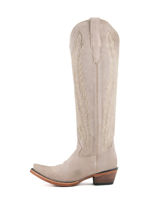 Light Sand Faux Suede Snip-Toe Embroidery Rhinestone Wide Calf Knee High Tall Cowgirl Boots