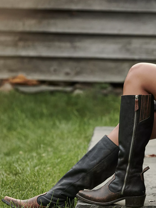Contrast Black And Brown Snp-Toe Side Full-Zip Mid Calf Cowgirl Boots