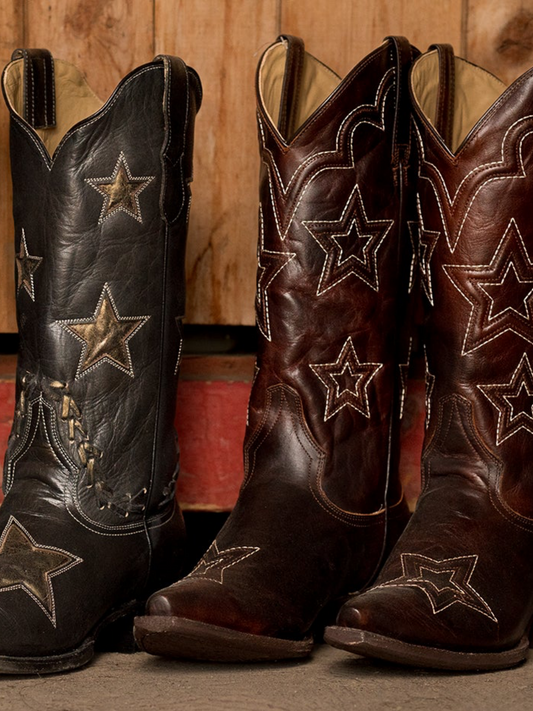 Dark Brown Snip-Toe Star Embroidery Wide Mid Calf Tall Cowgirl Boots
