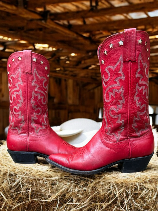 Red Embroidery White Star Inlay Pointed-Toe Wide Mid Calf Tall Cowgirl Boots