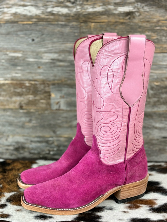 Contrast Fuchsia Faux Suede And Metallic Light Pink Embroidery Square-Toe Wide Mid Calf Tall Cowgirl Boots