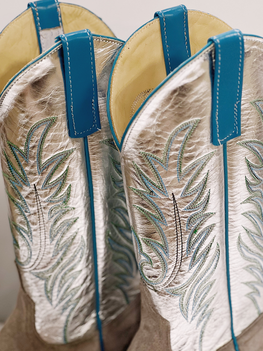 Turquoise Snip-Toe Metallic Gold Inlay Wide Mid Calf Tall Cowgirl Boots