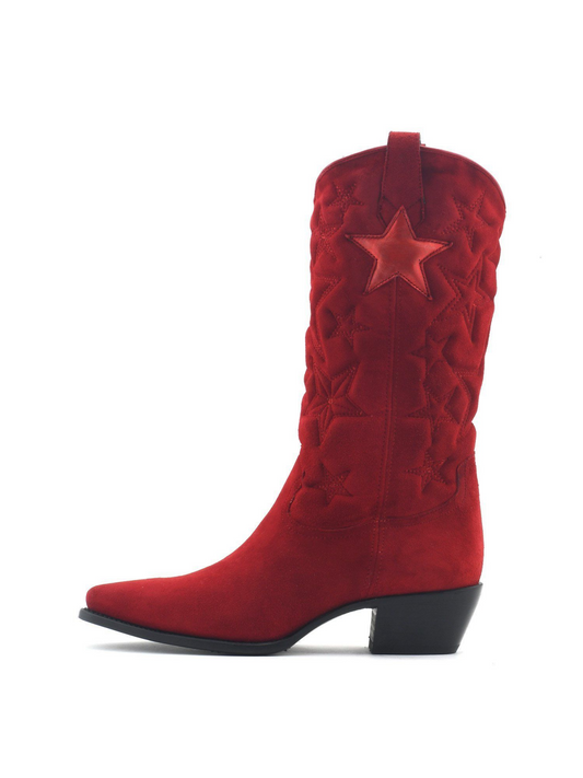 Red Faux Suede Padded Pointed-Toe Metallic Star Applique Embroidery Wide Mid Calf Tall Cowgirl Boots