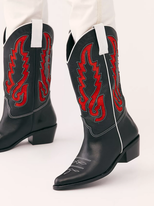 Black Snip-Toe Flame Inlay Embroidery Wide Calf Tall Knee High Cowgirl Boots