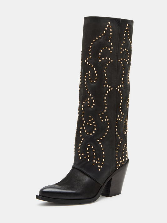 Black Pointed-Toe Classic Studded Padded Wide Mid Calf Cowgirl Boots