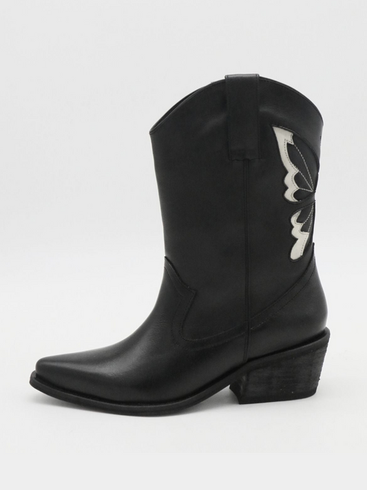 Black Snip-Toe Ivory Butterfly Inlay Wide Mid Calf Cowgirl Boots