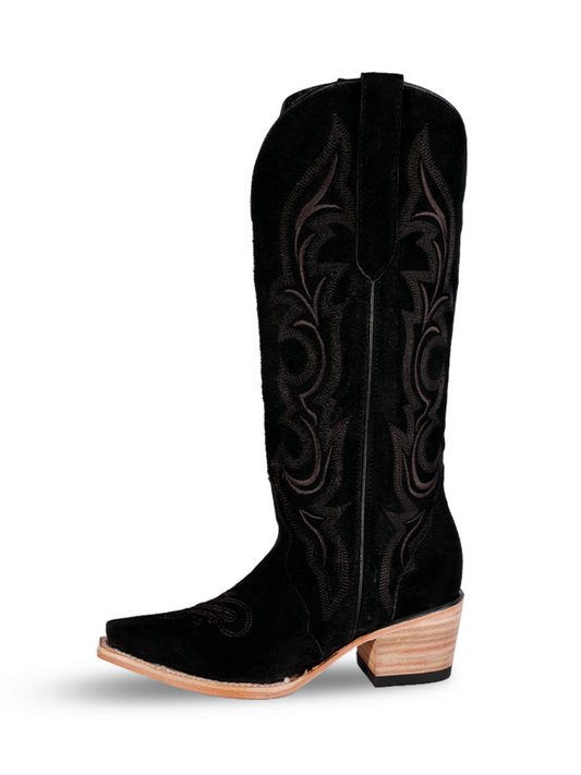 Black Faux Suede Snip-Toe Classic Embroidery Wide Mid Calf Tall Western Boots