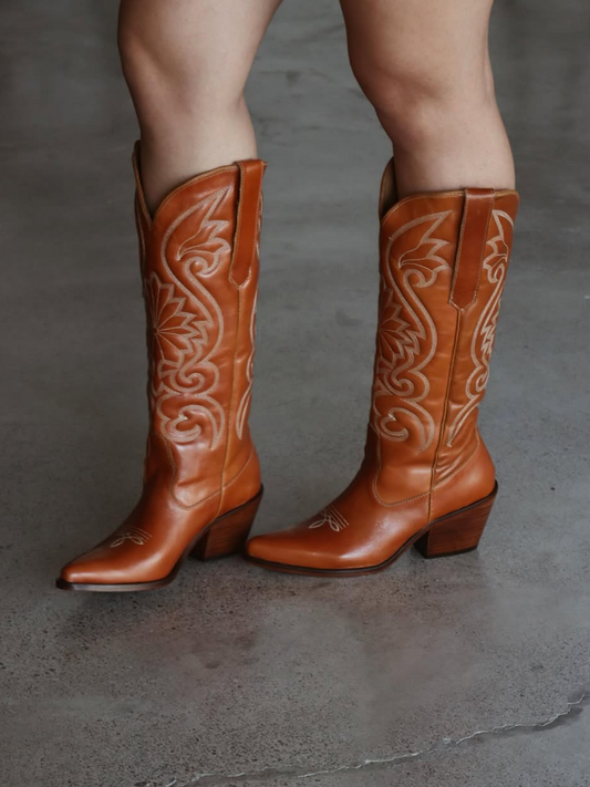 Fancy Embroidery Snip-Toe Wide Mid Calf Cowgirl Boots - Camel