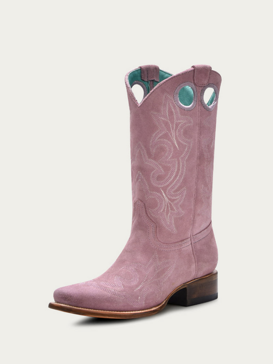 Faux Suede Cut-Out Square-Toe Embroidery Wide Mid Calf Cowgirl Boots - Lilac
