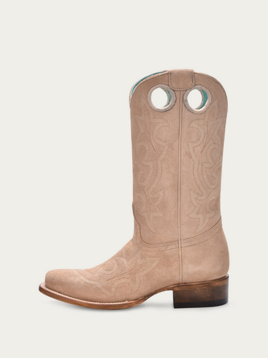Faux Suede Cut-Out Square-Toe Embroidery Wide Mid Calf Cowgirl Boots - Sand