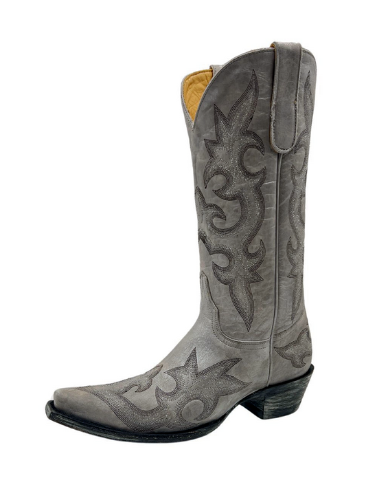 Distressed Silver Snip-Toe Embroidery Classic Wide Mid Calf Cowgirl Boots