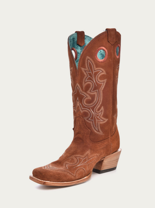 Faux Suede Cut-Out Square-Toe Embroidery Wide Mid Calf Cowgirl Boots - Brown