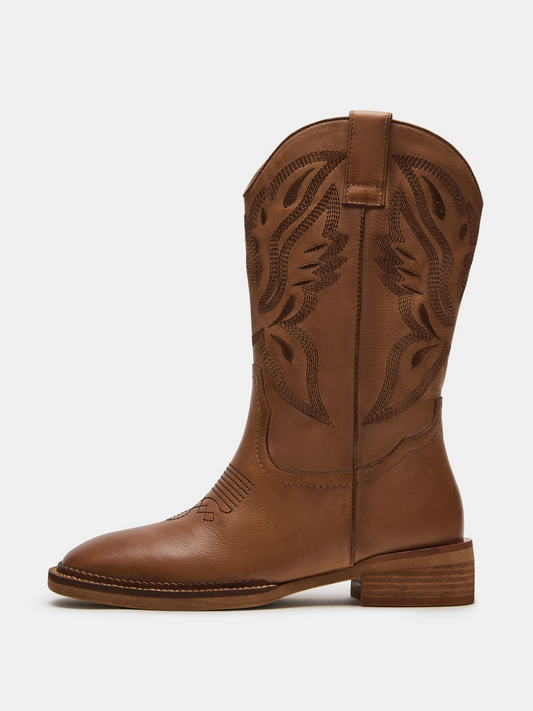 Caramel Square-Toe Floral Embroidery Wide Mid Calf Cowgirl Boots