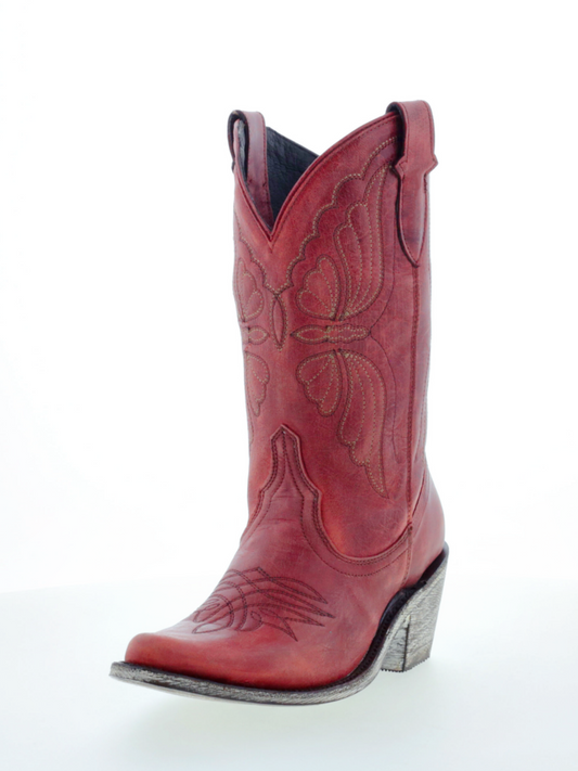 Butterfly Embroidery Almond-Toe Wide Mid Calf Cowgirl Boots - Red