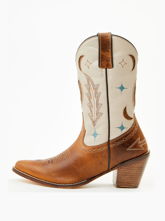 Contrast Brown And Ivory Almond-Toe Embroidery Moon Inlay Wide Mid Calf Cowgirl Boots