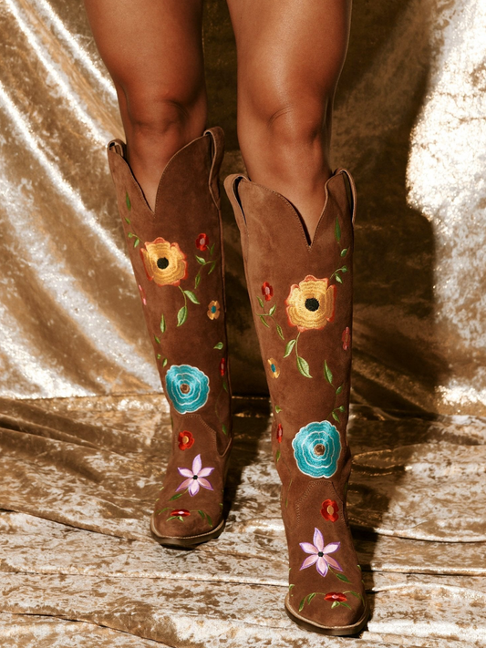 Colorful Floral Embroidery Faux Suede Snip-Toe Wide Mid Calf Cowgirl Boots - Brown