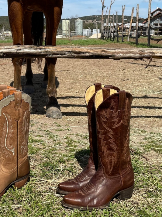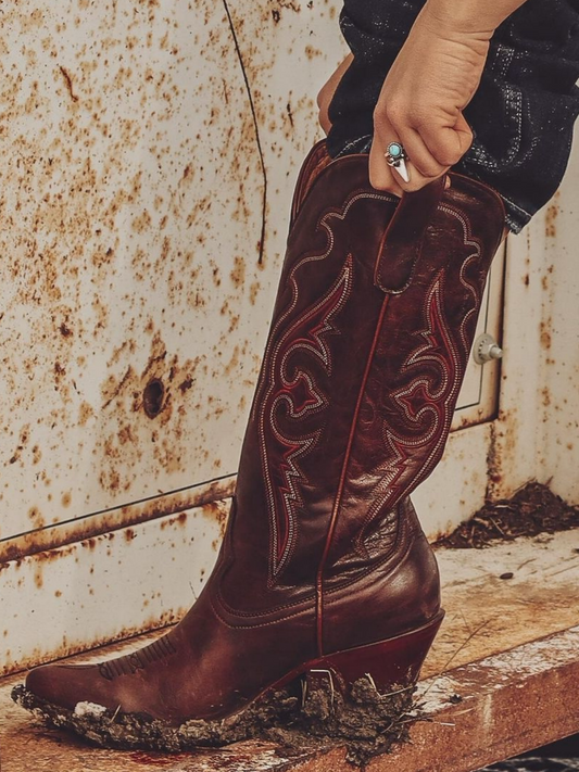 Classic Embroidery Snip-Toe Wide Mid Calf Tall Cowgirl Boots - Chocolate