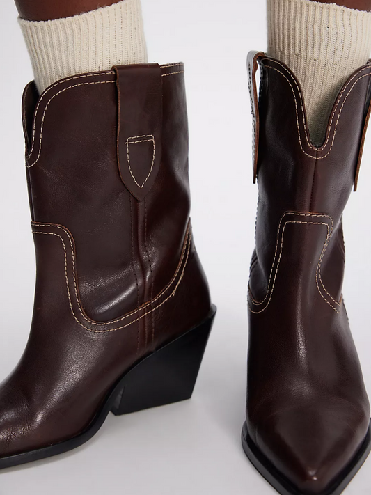 Chocolate Pointed-Toe Vegan Leather Stitch Wide Mid Calf Cowgirl Boots